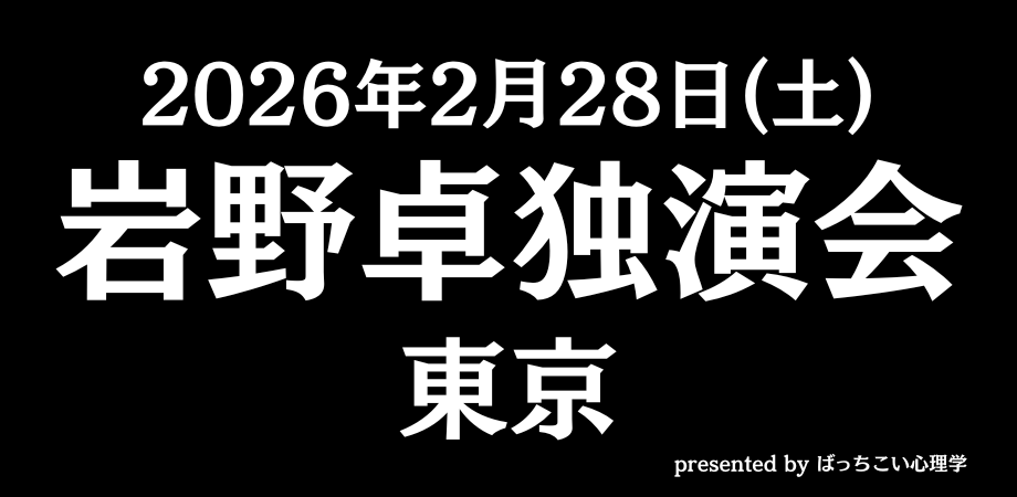 東京心理学フェスティバル2026は、心理学を愛する人たちが集まり、学びとエンタメと対話が交わる一日限定のイベントです。 夜のメインコンテンツとして、YouTube「ばっちこい心理学」でおなじみの岩野卓が自分自身の数奇な人生と心理学を語る「岩野卓独演会」、メンタルヘルス系YouTuberのオフラインイベント番外編、マインドフルネスなどの研究や臨床の知見に裏打ちされた専門家の話を、科学的根拠とエンタメとともに届ける少し変わった心理学フェスです。